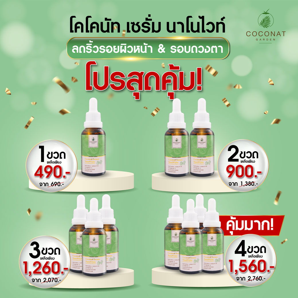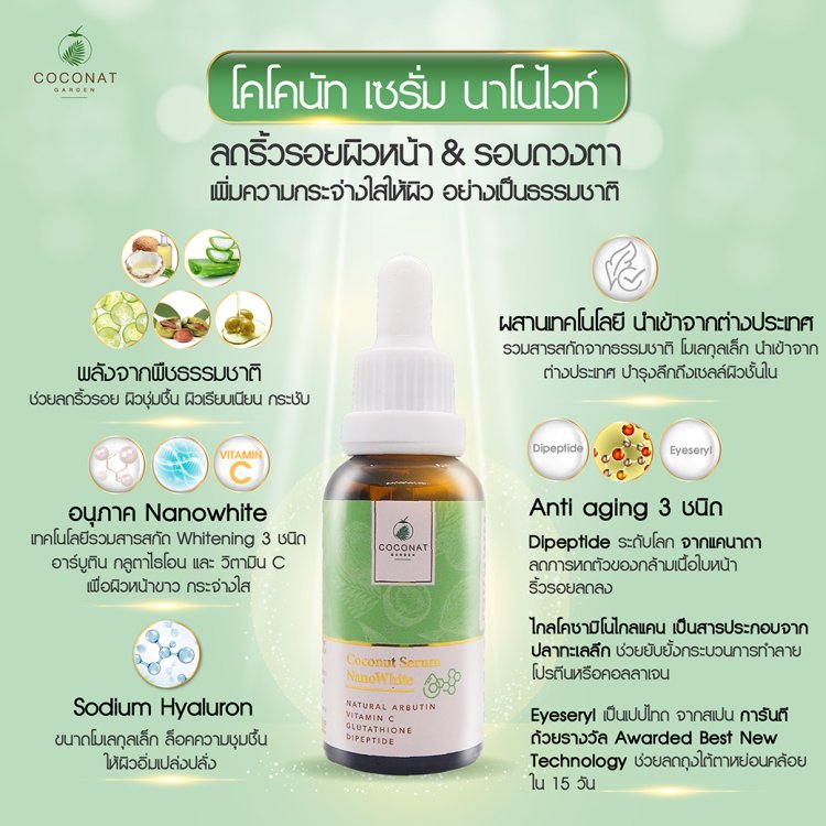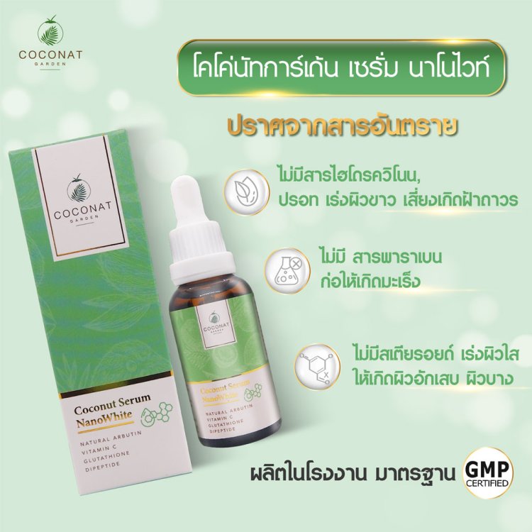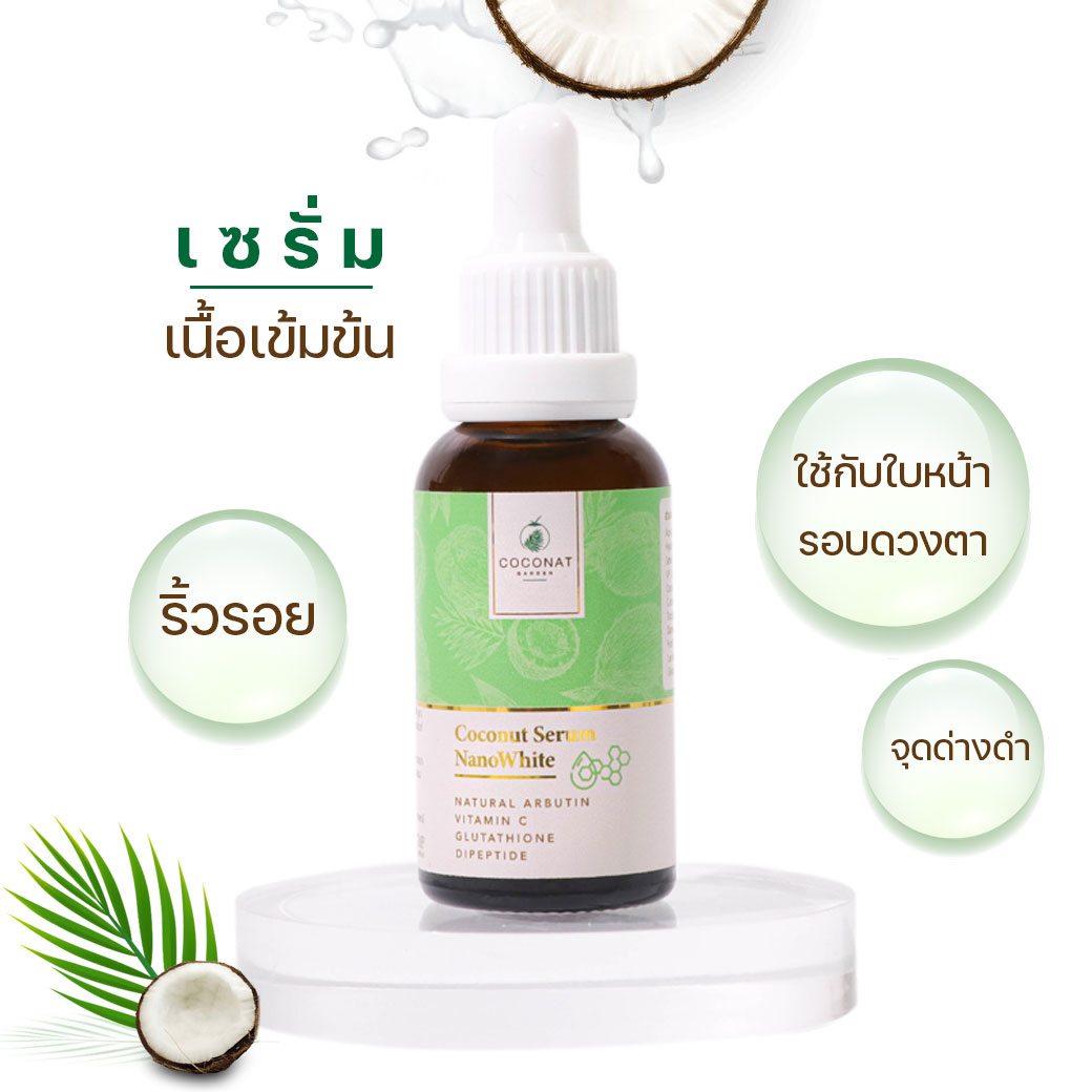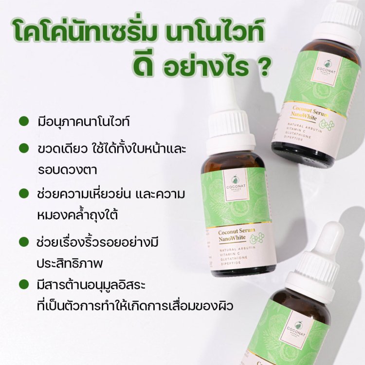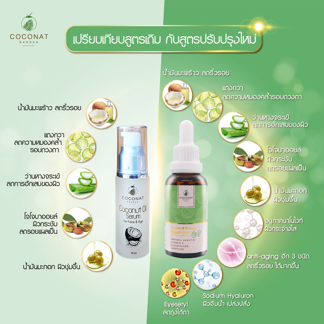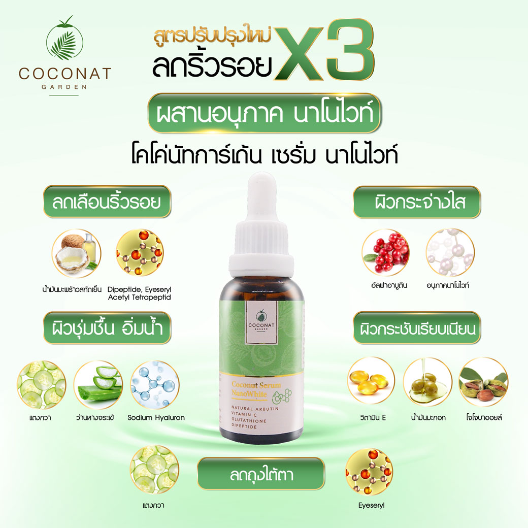 โคโคนัทเซรั่ม นาโนไวท์ คือ เซรั่มน้ำมันมะพร้าว สูตรเข้มข้น ตัวเดิม ปรับปรุงสูตรใหม่ เพิ่มส่วนผสมสารสกัดจากธรรมชาติ ที่ช่วย เรื่องลดริ้วรอย ได้มากขึ้นอีก เพิ่ม อนุภาคนาโนไวท์ (Nanowhite) เพื่อผิวกระจ่างใสอย่างเป็นธรรมชาติ
