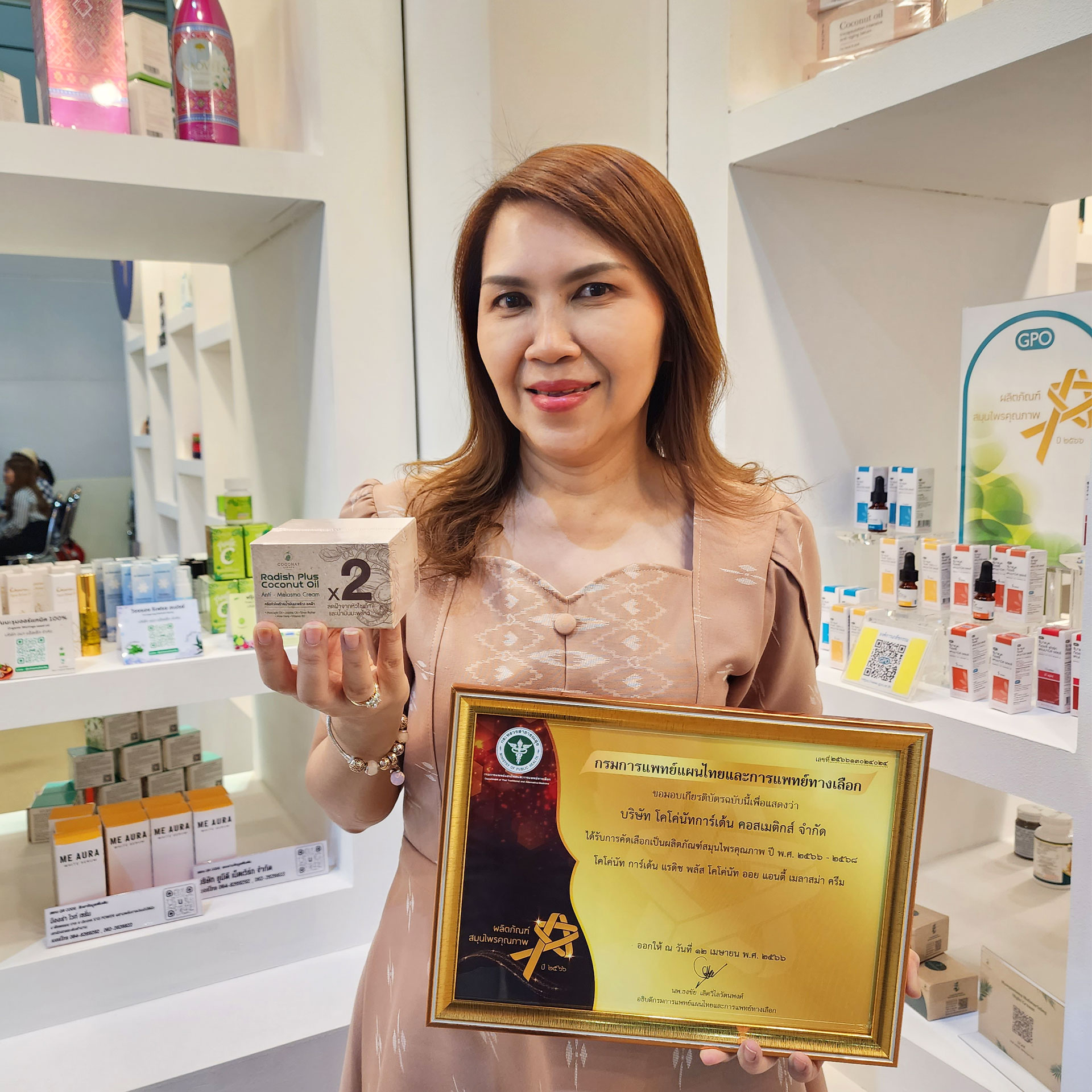 1. โคโค่นัท ออยล์ เอนแคป เซรั่ม ได้รับรางวัลผลิตภัณฑ์สมุนไพรคุณภาพ ปี 2566 (Premium Herbal Products)