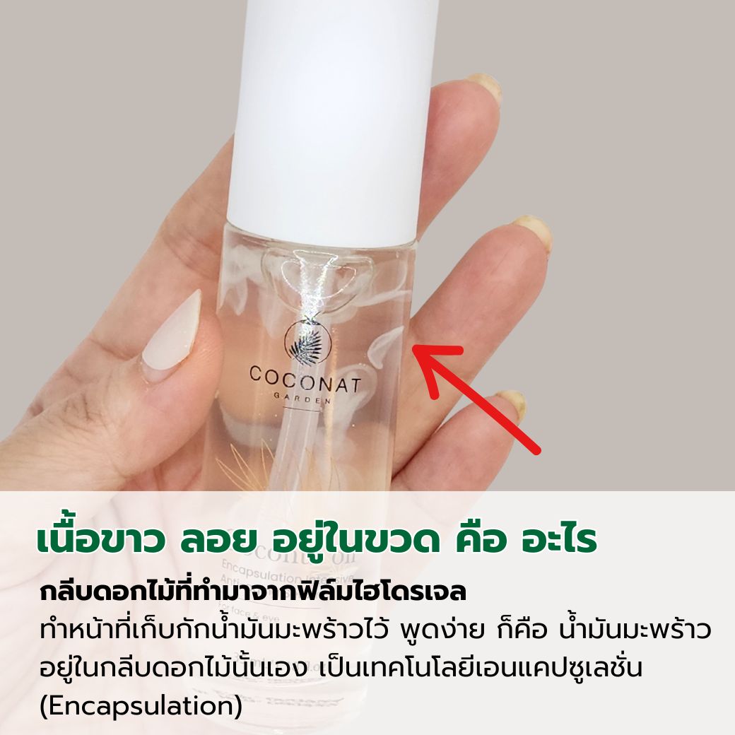 คือ การใช้เทคโนโลยีกักเก็บน้ำมันมะพร้าวบริสุทธิ์เข้มข้น (encapsulation) ที่ช่วยเพิ่มประสิทธิภาพการซึมเข้าสู่ผิวได้อย่างรวดเร็วและล้ำลึก ช่วยเพิ่มความชุ่มชื้น ลดเลือนริ้วรอยและจุดด่างดำได้ดีกว่าการใช้น้ำมันมะพร้าวเป็นส่วนผสมแบบเดิม ๆ ที่ผสมลงไป ซึ่งอาจสูญเสียประสิทธิภาพจากการผ่านความร้อน