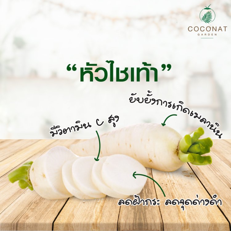 หัวไชเท้ามีวิตามิน C สูง ช่วยยับยั้งการเกิดเมลานิน ลดฝ้ากระ ลดจุดด่างดำ ลดการอักเสบ การระคายเคือง จากแสงแดดที่ทำลายใบหน้า (มีงานวิจัยรองรับ)